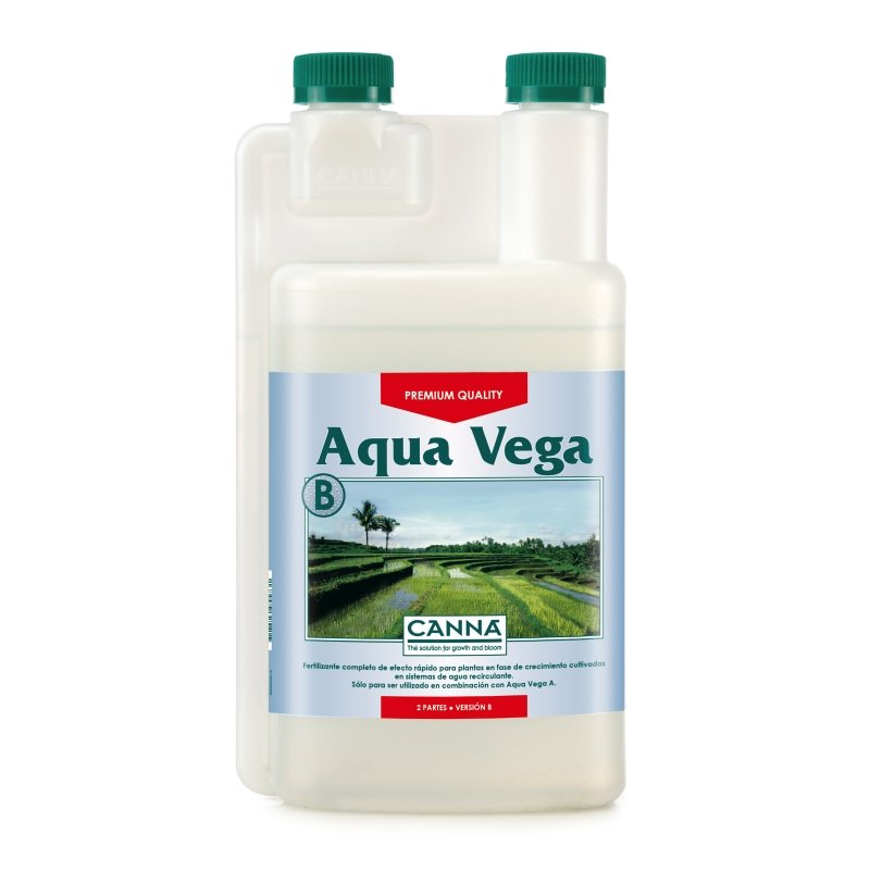 Aqua Vega A/B. Desarrollado especialmente para satisfacer las necesidades de la planta de forma óptima durante su crecimiento. Se usa en sistemas de recirculación, como el NFT, sistemas de flujo y reflujo y el cultivo en partículas de arcilla.