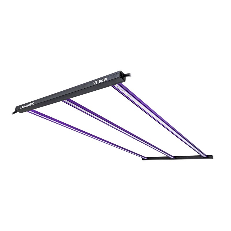 El VF90W consta de tres barras LED de 30 W con diodos blanco de 4000 K y blanco cálido de 3000 K, con una salida total de PPF de 244 μmol/s y una eficacia de 2,4 μmol/J.